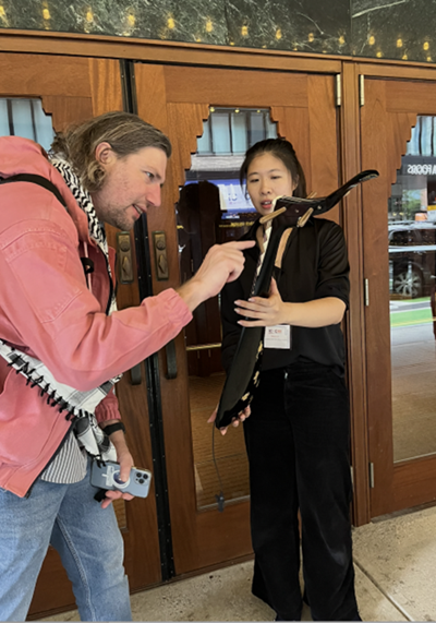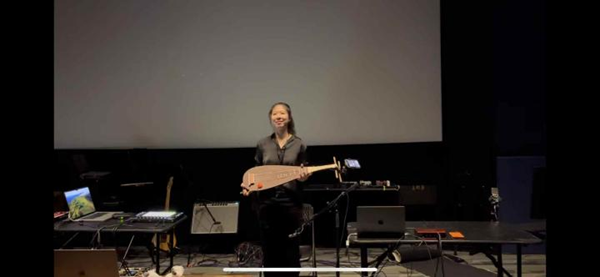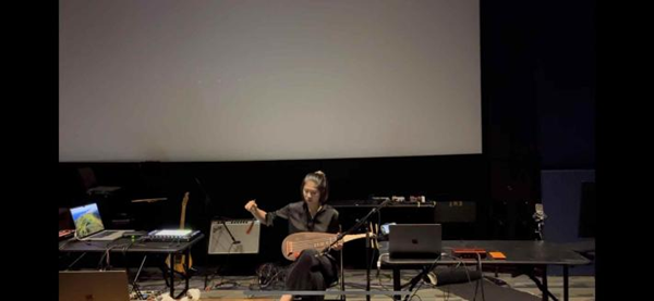 作品首次使用湖州市音声资源数据挖掘与智能服务技术重点实验室正在开发的明代魏氏乐琵琶音源“Pipa1617”。作曲家将手机附着在琵琶曲颈上作为数据驱动乐器,结合采样器和算法复音合成器,对传统琵琶音色进行了现代化诠释。在现场,林舒瑜博士还亲自演奏了学院于2022年复原的“魏氏乐”琵琶,完成了一场历史与当代、传统与先锋、即兴与预置的人机交互式对话。